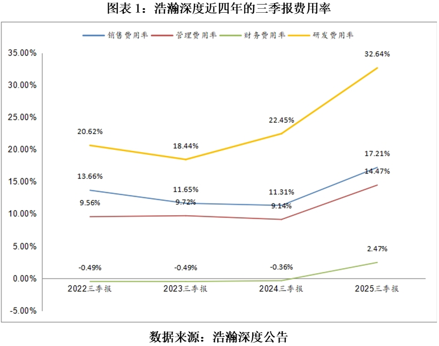 2025年前三季度,浩瀚深度实现营收2.49亿元,同比下降22%,归母净亏损918万元,同比下降125%,业绩承压明显。亏损主要来自费用上行的影响:前三季度销售费用率、管理费用率、财务费用率、研发费用率全面上升,其中研发费用率32.64%,同比增长10.19%,上升最为显著,这也印证了公司正加大新业务研发投入以推动扩张的战略。同时,受可转债等因素影响,利息费用同比增加约614万元,进一步放大了利润表的阶段性承压。