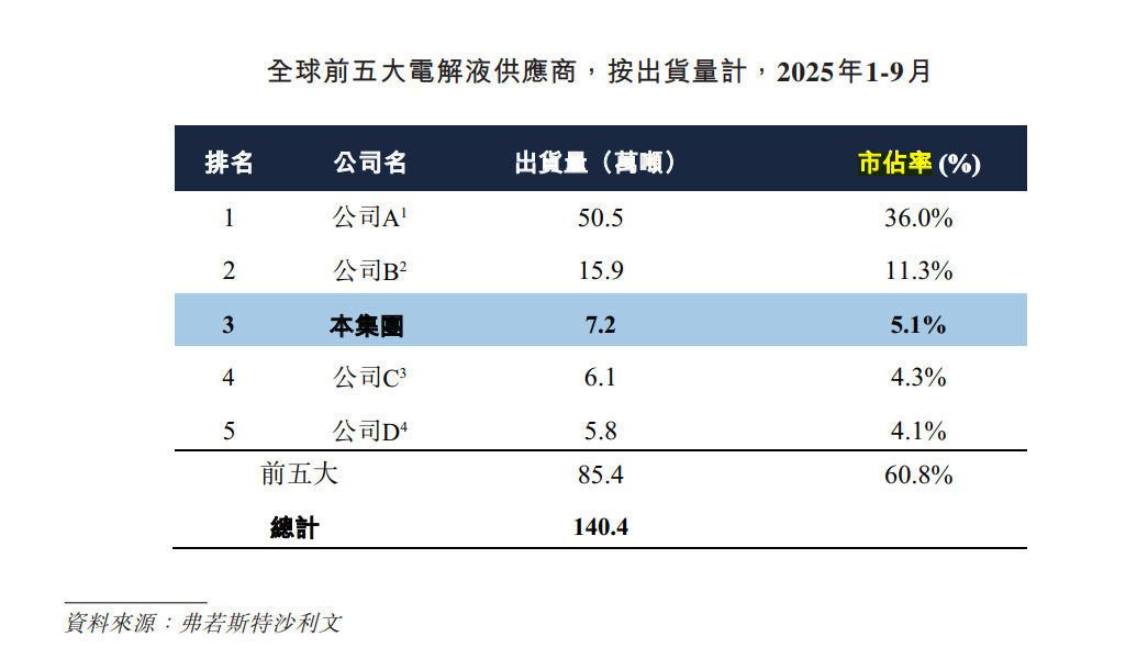 根据弗若斯特沙利文的资料,过去五年,昆仑新材的电解液出货量排名前列,市场份额从2020年的1.8%提升至2024年的4.0%,成为电解液领域的“黑马”。截至2025年三季度末,公司在全球锂电池电解液供应商中排名第三,市场份额为5.0%。