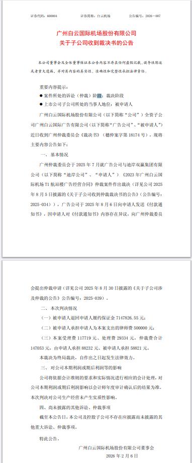 根据白云机场公告,广告公司近日收到广州仲裁委员会出具的《裁决书》,就其与迪岸双赢集团有限公司(下称“迪岸公司”)的广告经营合同争议作出终局裁决,该裁决自作出之日起发生法律效力。