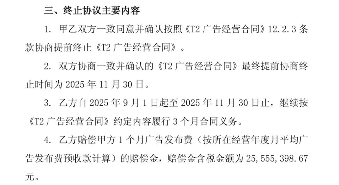 据悉,《T2广告经营合同》原经营期限自2024年3月6日起至2031年3月5日止,合同履行期间,第一经营年度广告经营权转让费迪岸公司已全额支付,第二经营年度实际计费至2025年11月30日,迪岸公司已支付15333.24万元,仍有7351.55万元未支付,双方约定迪岸公司在合同终止前继续履行3个月合同义务后完成交接,广告公司同步推进T2航站楼广告重新招商工作,当时公司称该终止事项不会对财务和经营状况产生重大影响。