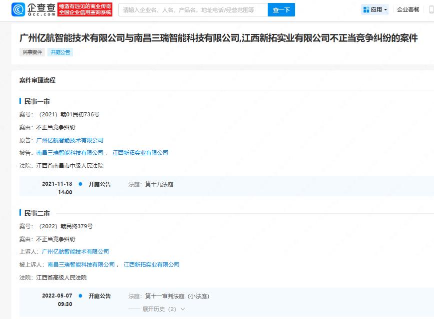 2021年末,广州亿航智能技术有限公司(下称:亿航智能)向法院起诉了三瑞智能与江西新拓。该案件于2021年11月18日进行首次开庭,案由为不正当竞争纠纷。在2022年5月,此案件被上交至江西省高级人民法院进行二审。