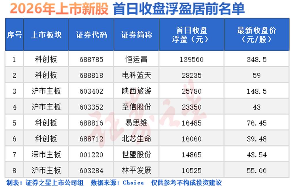 登录科创板的恒运昌(688785)首日收盘浮盈高达13.96万元,在年内新股中遥遥领先;登陆科创板的电科蓝天(688818)首日收盘浮盈达2.82万元,排名第二;登陆主板的陕西旅游(603402)首日收盘浮盈达2.58万元;登陆主板的至信股份(603352)首日收盘浮盈达2.34万元。此外,易思维、北芯生命、世盟股份、林平发展等4只新股首日收盘浮盈也在1万元以上。具体名单如下: