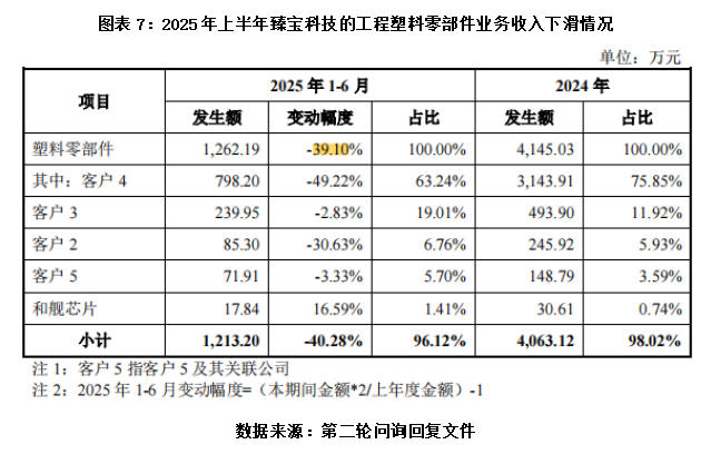 奇怪的是,作为贡献高毛利的核心业务,2025年上半年,臻宝科技工程塑料零部件业务销售收入同比下降39.10%(年化),降幅显著,核心原因便是对客户4及客户2的当期销售金额较上年大幅下降。其中,臻宝科技与客户4的交易金额降至798.20万元,同比降幅高达49.22%,曾经的核心合作业务突然出现“断崖式”收缩。