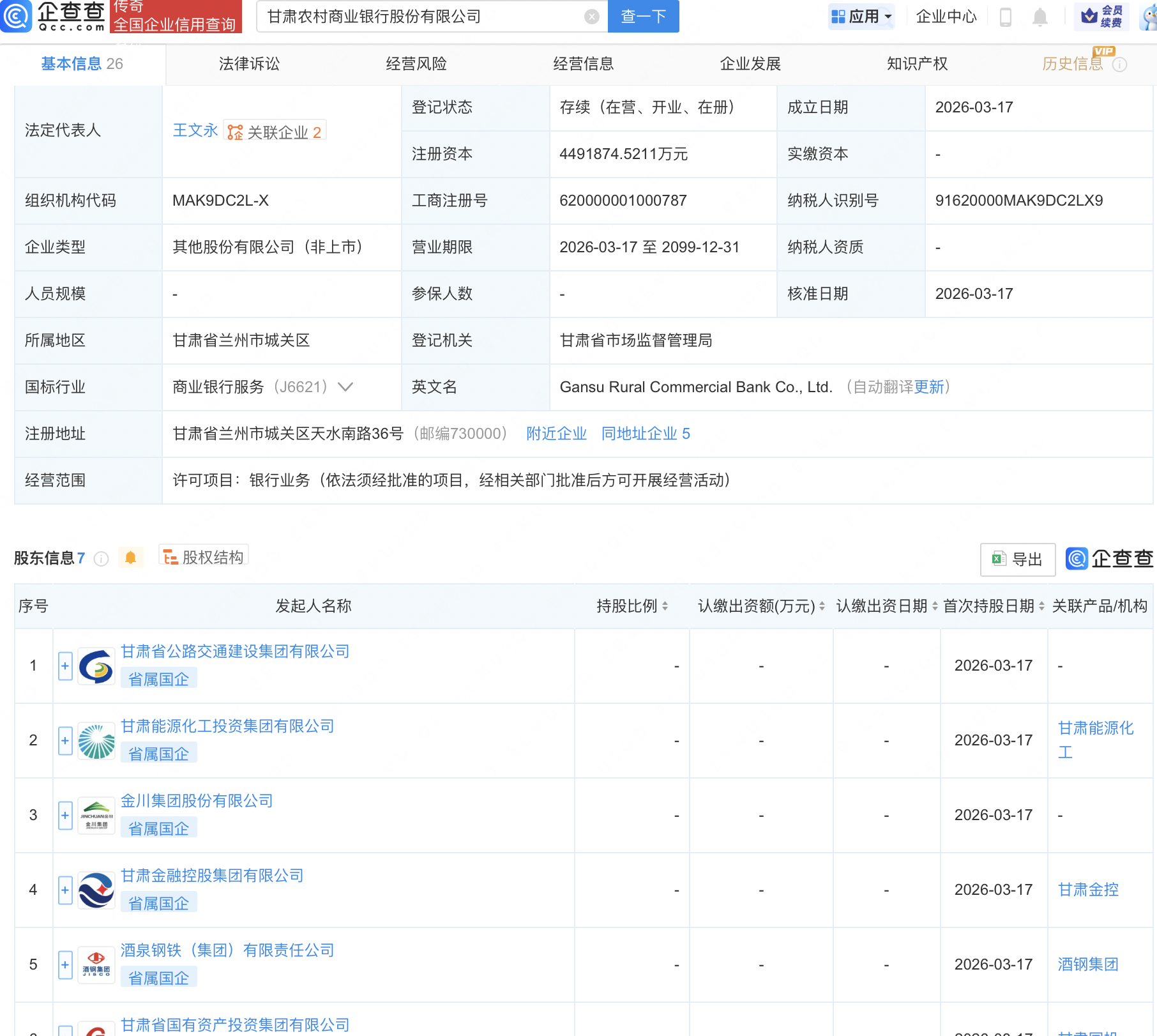 企查查APP显示,近日,甘肃农村商业银行股份有限公司成立,注册资本约449亿元,经营范围包含银行业务。企查查股权穿透显示,该公司由甘肃省公路交通建设集团有限公司、酒泉钢铁(集团)有限责任公司等共同持股。