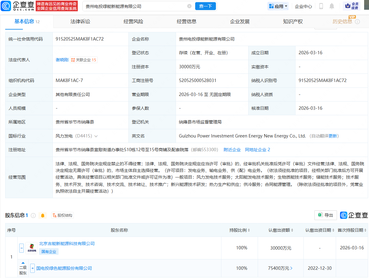 企查查APP显示,近日,贵州电投绿能新能源有限公司成立,法定代表人为谢晓刚,注册资本为3亿元,经营范围包含:发电业务、输电业务、供(配)电业务;太阳能发电技术服务;生物质能技术服务;储能技术服务等。企查查股权穿透显示,该公司由电投绿能(000875)间接全资持股。