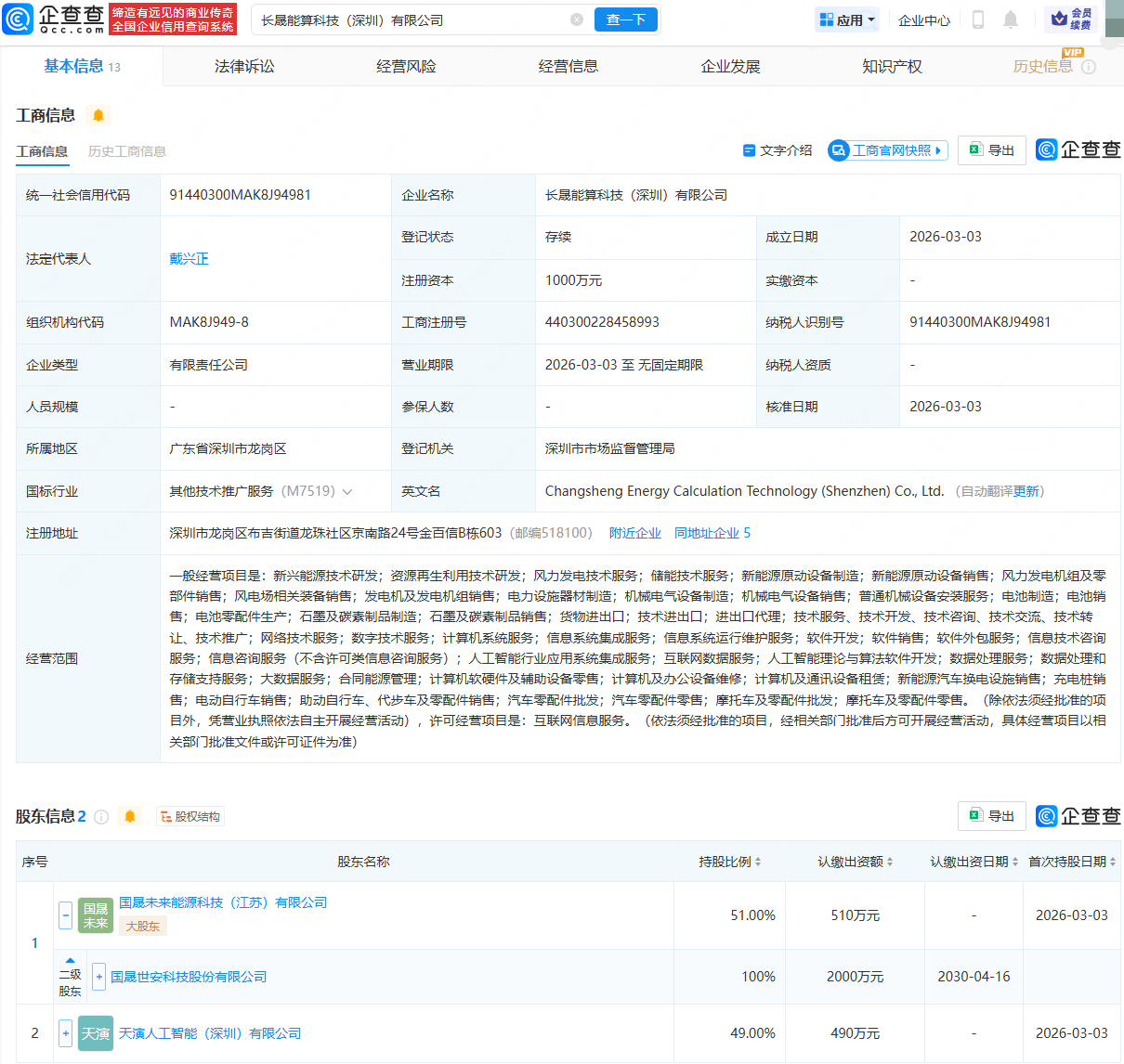 企查查APP显示,近日,长晟能算科技(深圳)有限公司成立,法定代表人为戴兴正,注册资本为1000万元,经营范围包含:风力发电技术服务;储能技术服务;新能源原动设备制造;人工智能行业应用系统集成服务;互联网数据服务等。企查查股权穿透显示,该公司由国晟科技(603778)全资子公司国晟未来能源科技(江苏)有限公司、天演人工智能(深圳)有限公司共同持股。