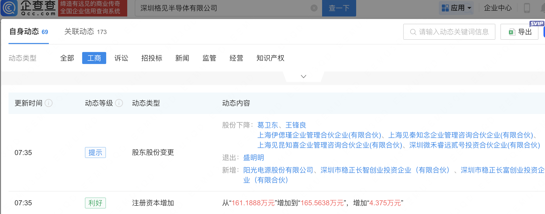 企查查APP显示,近日,深圳格见半导体有限公司发生工商变更,新增阳光电源(300274)等为股东,同时注册资本增至165.56万元。企查查信息显示,该公司成立于2022年,经营范围包含:集成电路设计;集成电路芯片设计及服务;软件开发等。据其官网,格见半导体专注于高端实时控制DSP芯片设计,全力服务于数字能源、数字电源、工业自动化、智能汽车、机器人、高端家电和电网轨交等领域。