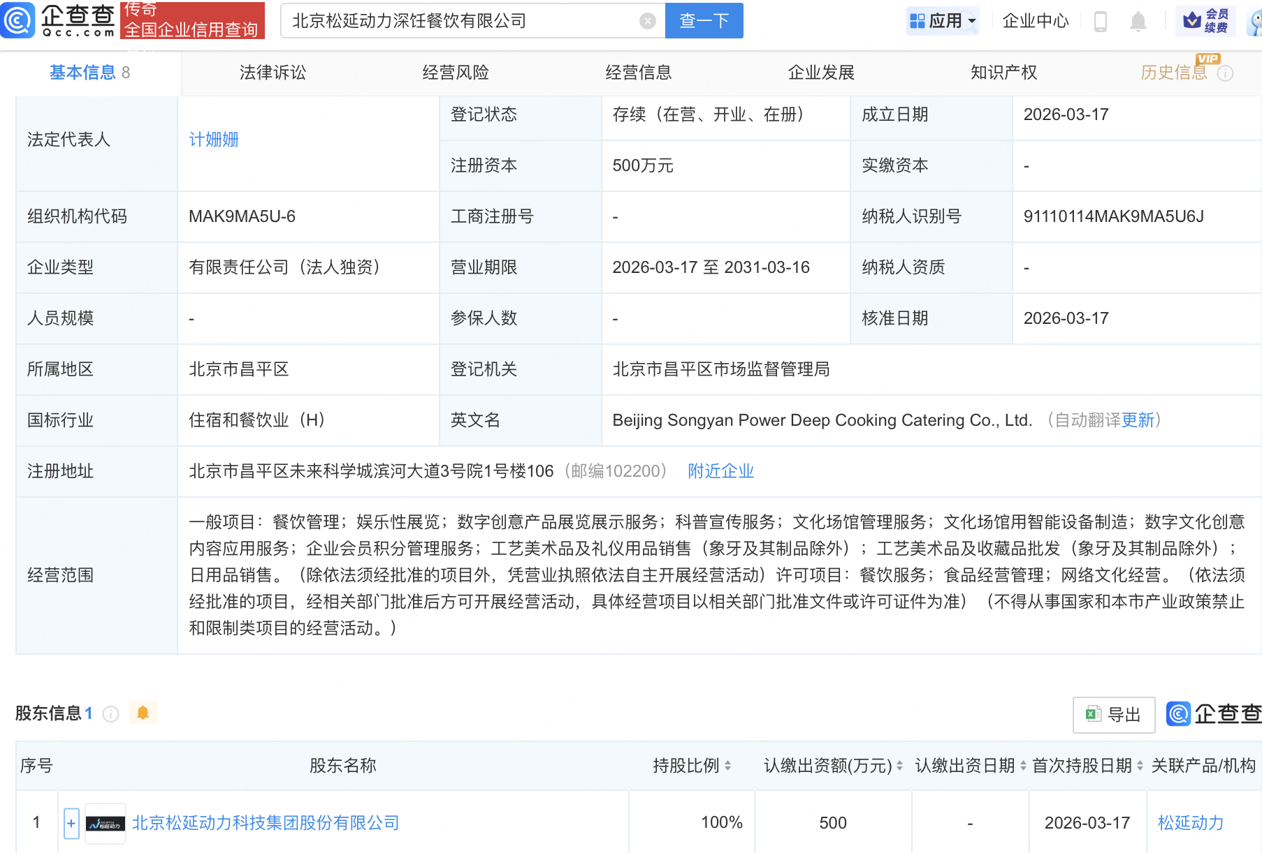 企查查APP显示,近日,北京松延动力深饪餐饮有限公司成立,经营范围包含:餐饮管理;娱乐性展览;数字创意产品展览展示服务;餐饮服务等。企查查股权穿透显示,该公司由北京松延动力科技集团股份有限公司全资持股。