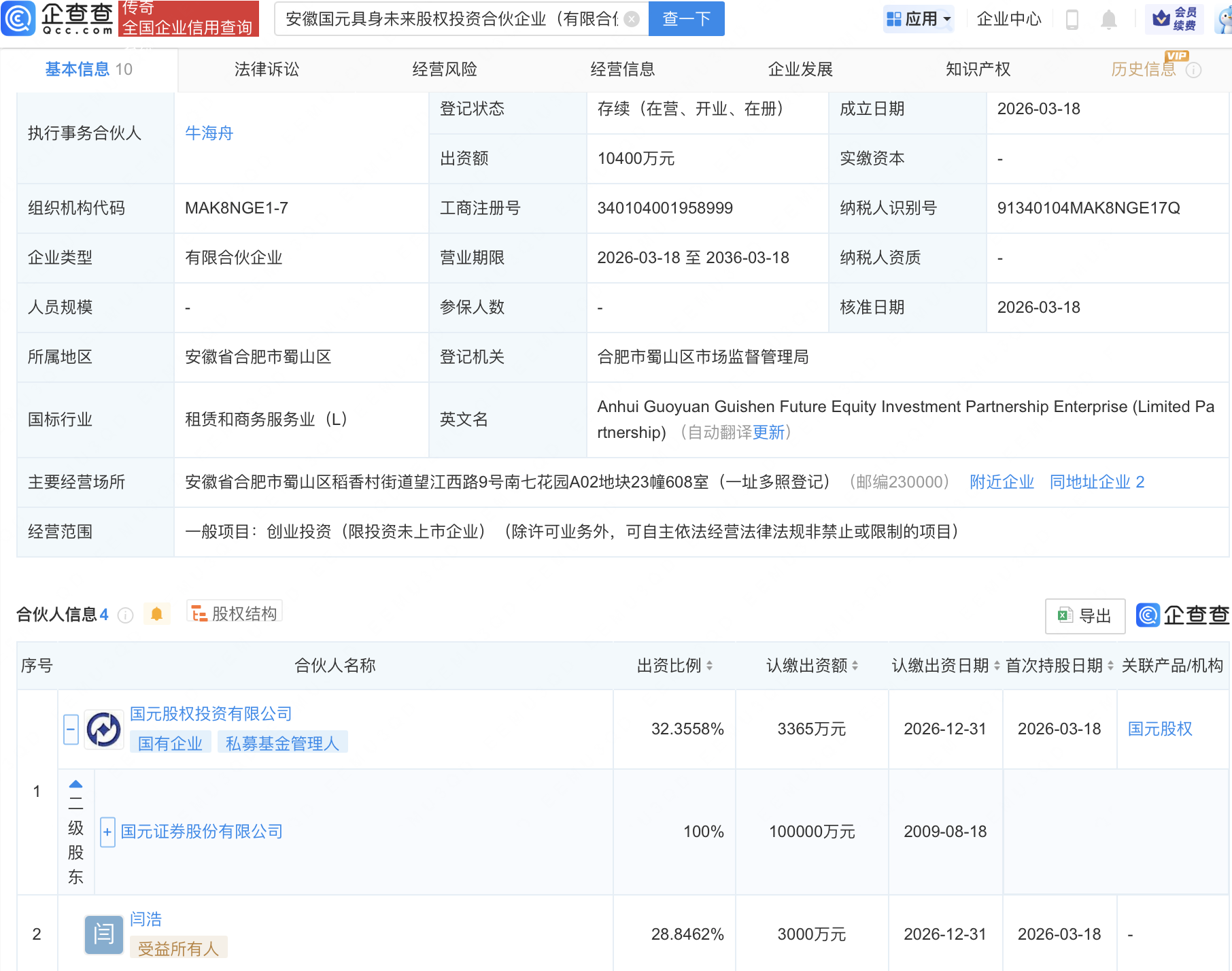 企查查APP显示,近日,安徽国元具身未来股权投资合伙企业(有限合伙)成立,经营范围包含:创业投资(限投资未上市企业)。企查查股权穿透显示,该企业由国元证券(000728)全资子公司国元股权投资有限公司等共同出资。