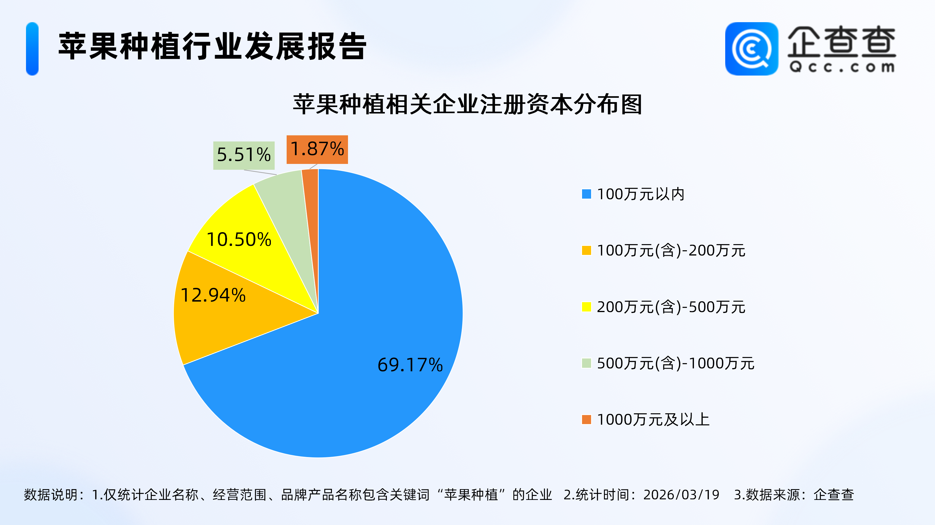 企查查数据显示,从注册资本来看,苹果种植相关企业多为轻量级企业,注册资本在200万元以下的相关企业合计占比超八成,其中注册资本在100万元以内的企业最多,占比69.17%,注册资本在100万元(含)-200万元的企业占比12.94%。