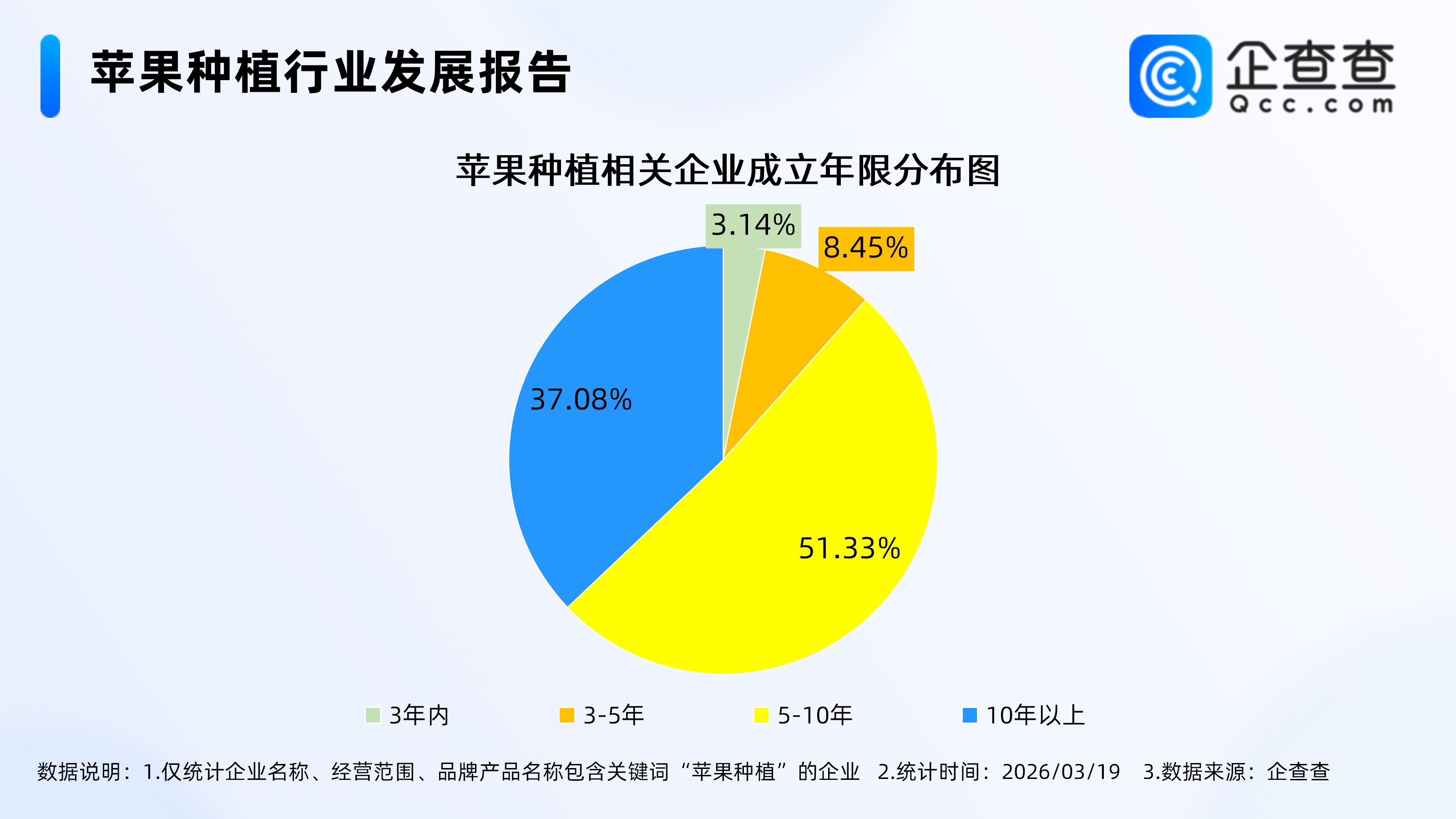 企查查数据显示,截至3月19日,国内现存7411家苹果种植相关企业,2025年全年注册58家,截至目前,今年已注册13家。从经营时间来看,现存的苹果种植相关企业多为老牌企业,成立年限在5-10年的企业最多,占比过半,达51.33%。成立10年以上的相关企业占比37.08%。