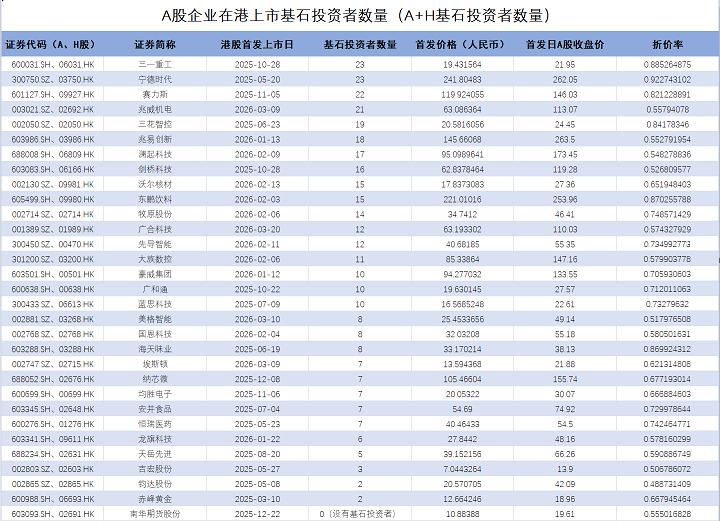 据金证互通牛牛研究中心数据显示,2025年至今,H股发行价/A股首发日股价超过8折共有5家公司,3家公司基石投资者超过20家,另外两家的基石投资者分别为19家和8家。而基石投资者低于10家的上市公司共计14家,其中11家H股发行价/A股首发日股价低于7折共有11家。