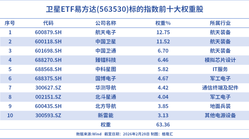 卫星ETF易方达(563530)跟踪中证卫星产业指数,涉及卫星制造、卫星发射、卫星通信、卫星导航、卫星遥感以及应用等领域的上市公司,权重股囊括卫星制造(中国卫星、航天电子)、运营(中国卫通)、导航(北斗星通、华测导航)、遥感(中科星图)、核心器件(臻镭科技、国博电子)等。