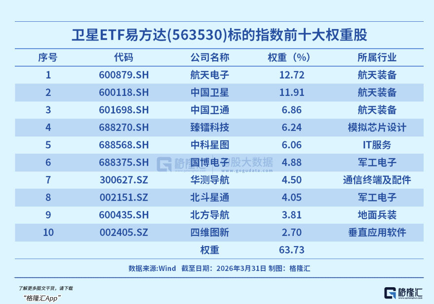 卫星ETF易方达(563530)跟踪中证卫星产业指数,涉及卫星制造、卫星发射、卫星通信、卫星导航、卫星遥感以及应用等领域的上市公司,权重股囊括卫星制造(中国卫星、航天电子)、运营(中国卫通)、导航(北斗星通、华测导航)、遥感(中科星图)、核心器件(臻镭科技、国博电子)等。