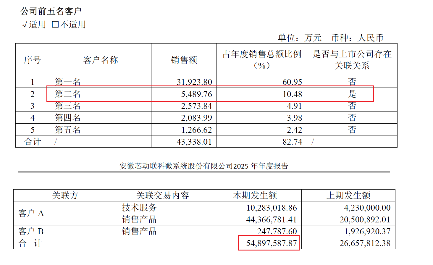 其中,芯动联科2025年第二大客户即“客户A”和“客户B”,年度销售额5489.76万元,占公司总销售额的10.48%。
