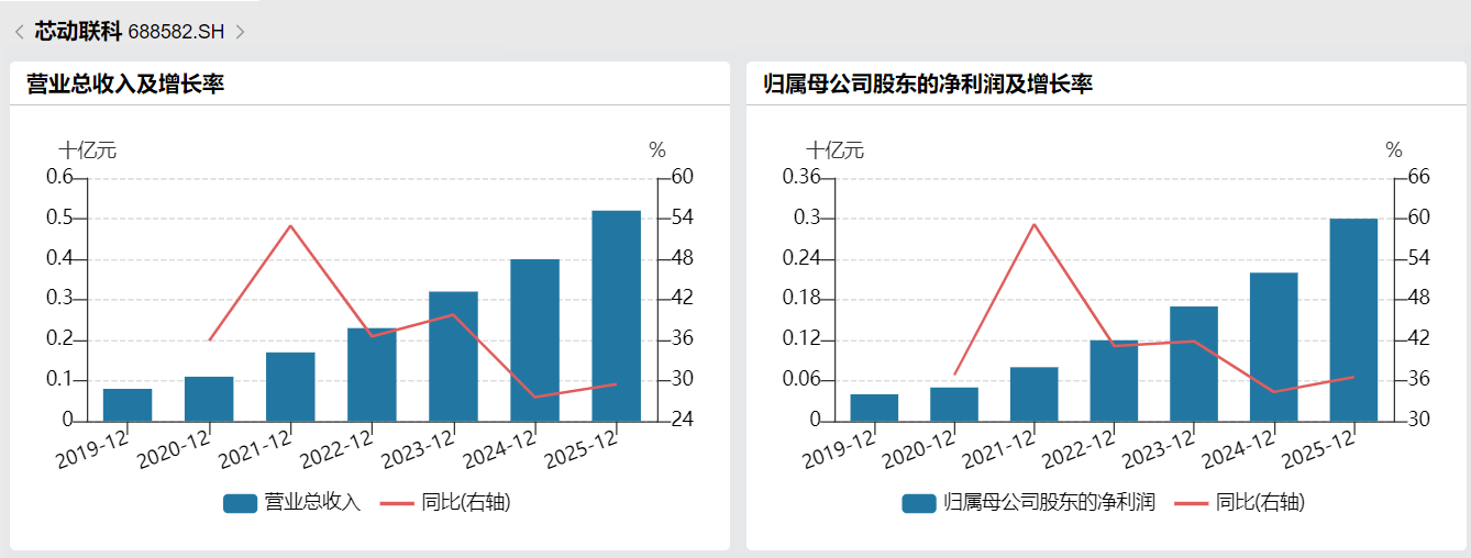 此前,芯动联科披露2025年年报。公司去年营收、净利润分别为5.24亿元、3.03亿元,同比分别增长29.48%、36.56%。而且,自公司披露财务数据以来,营收、净利增速均在27%以上。